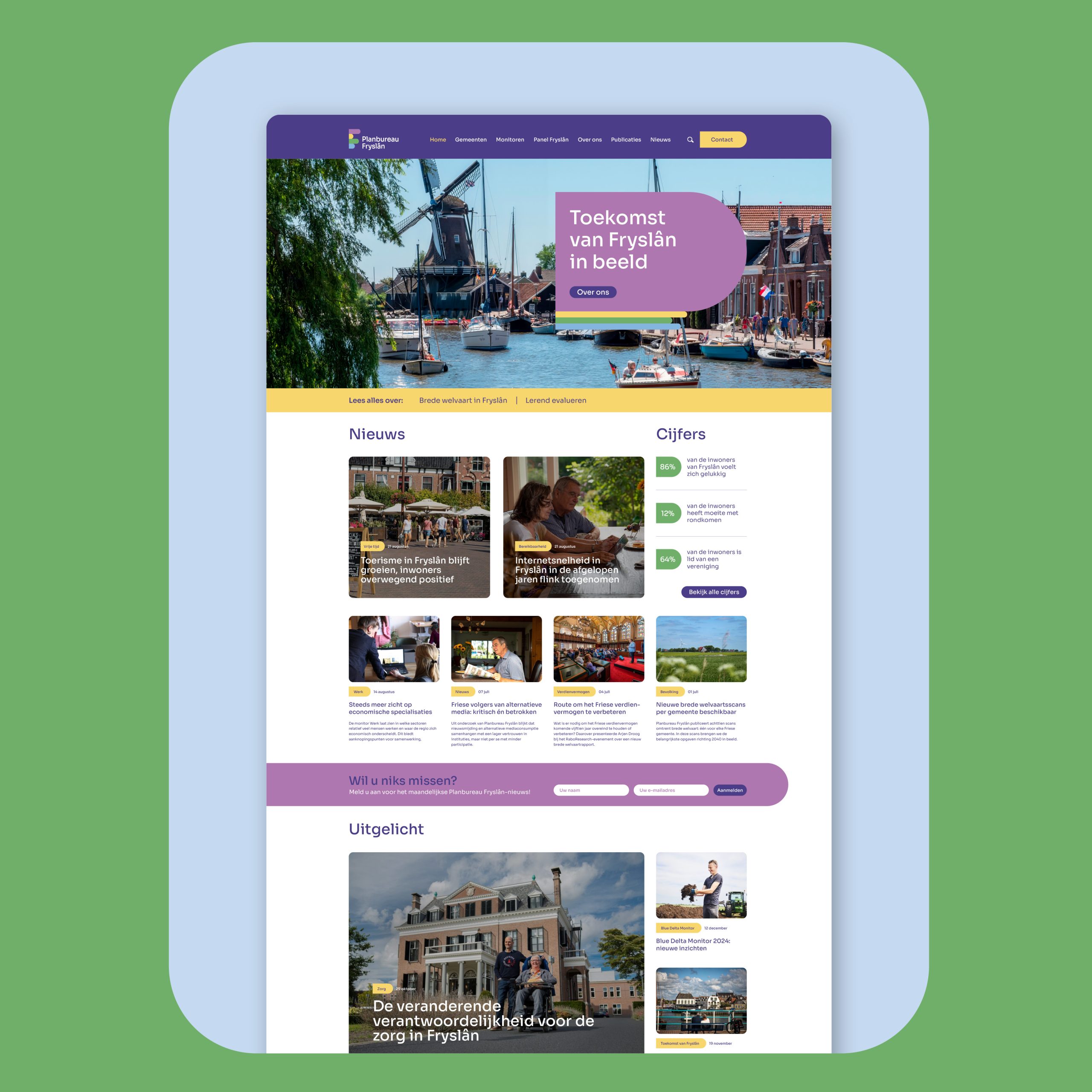 De nieuwe huisstijl maakt het werk van Planbureau Fryslân zichtbaar en begrijpelijk. Complexe inzichten worden toegankelijker, zonder aan inhoud te verliezen. De visuele taal zorgt voor samenhang en herkenning in alle communicatie. Daardoor is het voor medewerkers eenvoudiger geworden om het merk consequent toe te passen in verschillende middelen. De stijl is zichtbaar in alles: van de vernieuwde website en presentatiemateriaal tot factsheets en rapporten, en wordt ook doorvertaald naar de signing van het kantoorpand. Zo ondersteunt de huisstijl de rol van Planbureau Fryslân als onafhankelijke richtingwijzer voor Fryslân.